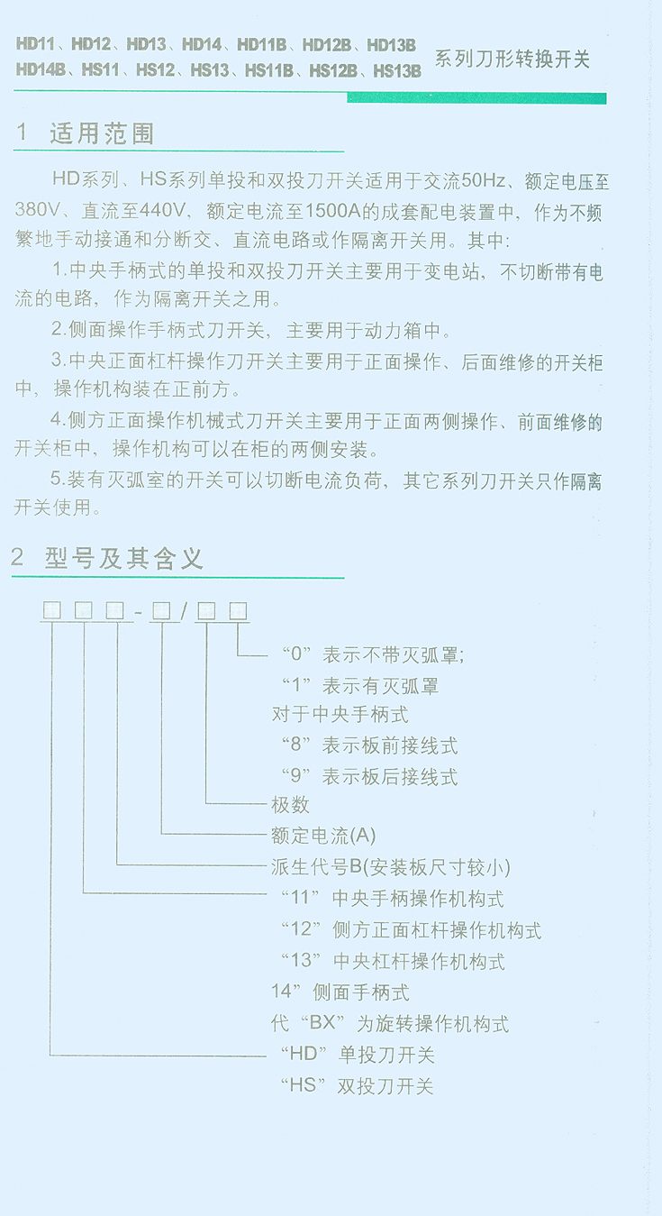 HD11、HD12、HD13、HD14、HD11B、HD13B、HD14B、HS11、HS12、HS13、HS11B、HS13B系列刀形轉換開關