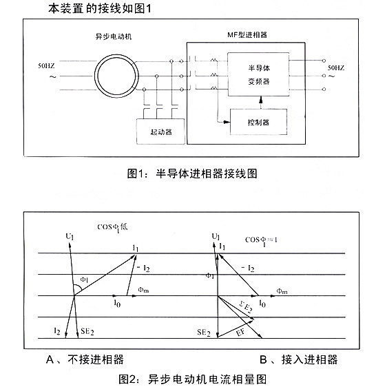 DYF系列半導體進相器的主體是一臺自控式半導體變頻器。它能自動跟蹤電機轉速的變化,把50Hz的交流電轉變成與異步電動機的轉子電流頻率相同的電勢EF,施加到繞線式異步電動機的轉子繞組上,以改變電機的轉子和定子電流的相位(見圖2〕。使異步電動機的功率因數COS Φ1明顯提高.從電網吸取的無功功率大大減少。